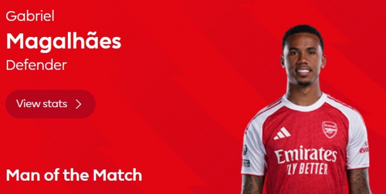 本场比赛加布里埃尔为球队先拔头筹,赛后他也当选英超官方球迷票选全场最佳球员。