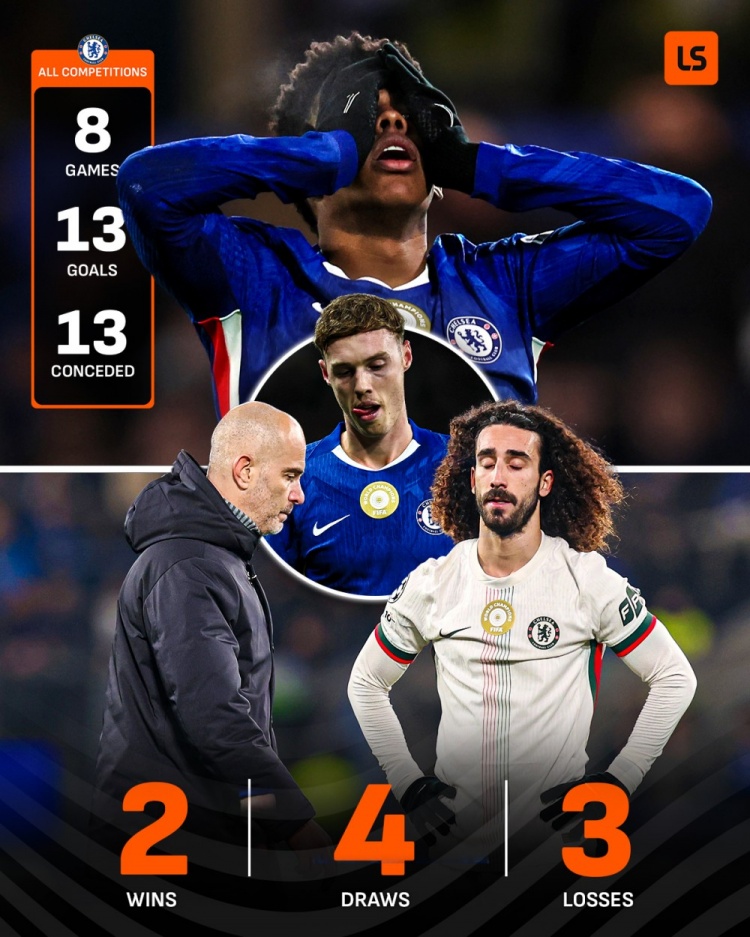 据媒体统计,11月3-0击败巴萨之后,切尔西近9场比赛仅取胜2场,具体战绩2胜4平3负。