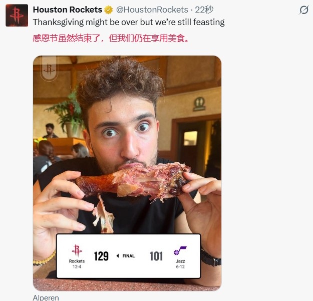 - 嘲讽拉满!火箭官方:感恩节虽然结束了 但我们仍在享用美食