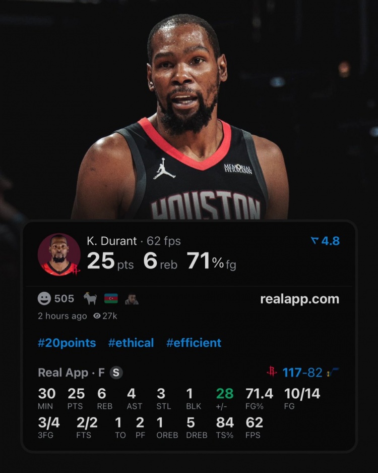 据统计,这是杜兰特生涯第69次单场砍下25+且真实命中率超过80%,与哈登并列历史第二,仅次于库里(102场)!