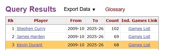 - KD生涯69次单场轰25+且真实命中率超80% 追平哈登仅次于库里