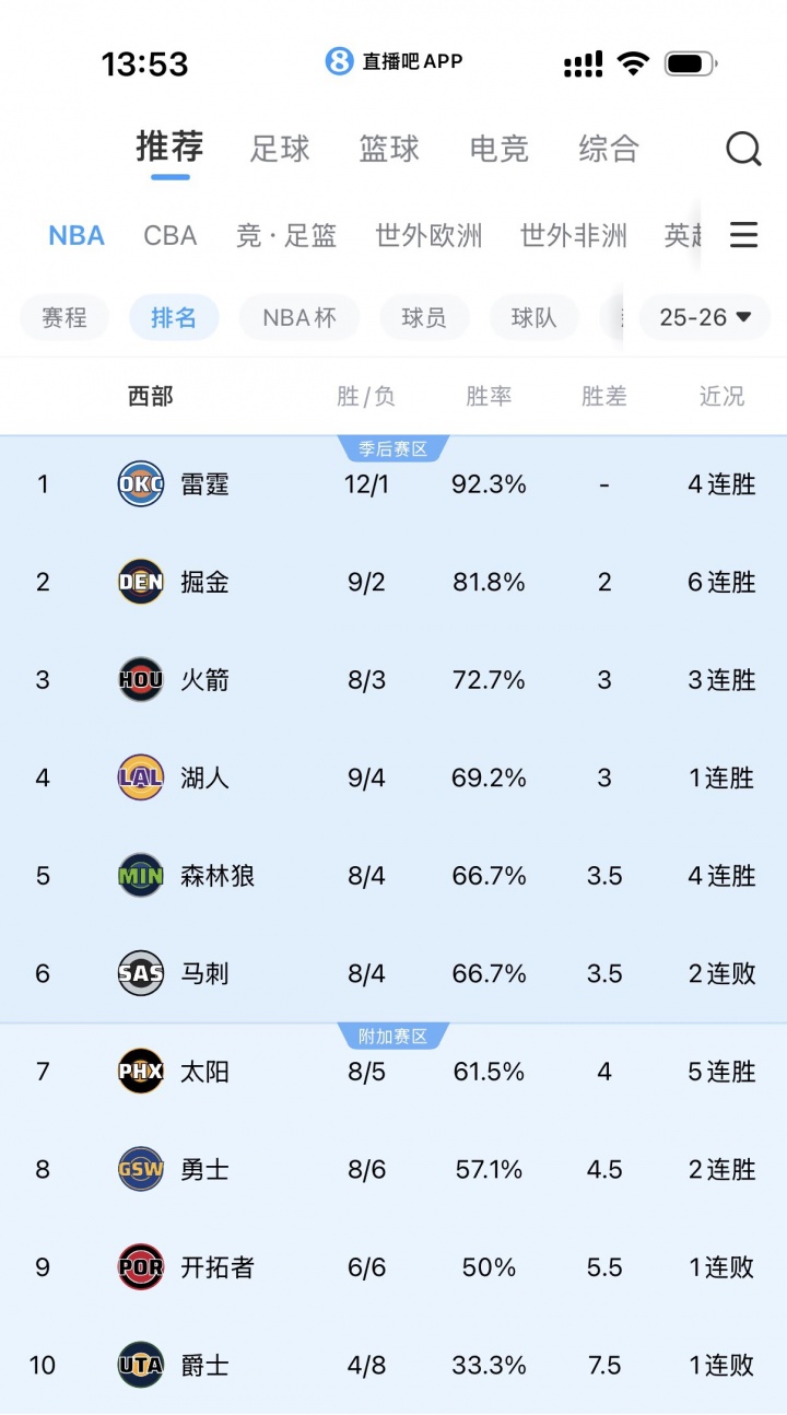 勇士晚些时候战胜马刺,马刺的战绩从8-3变成了8-4,排名被火箭反超;