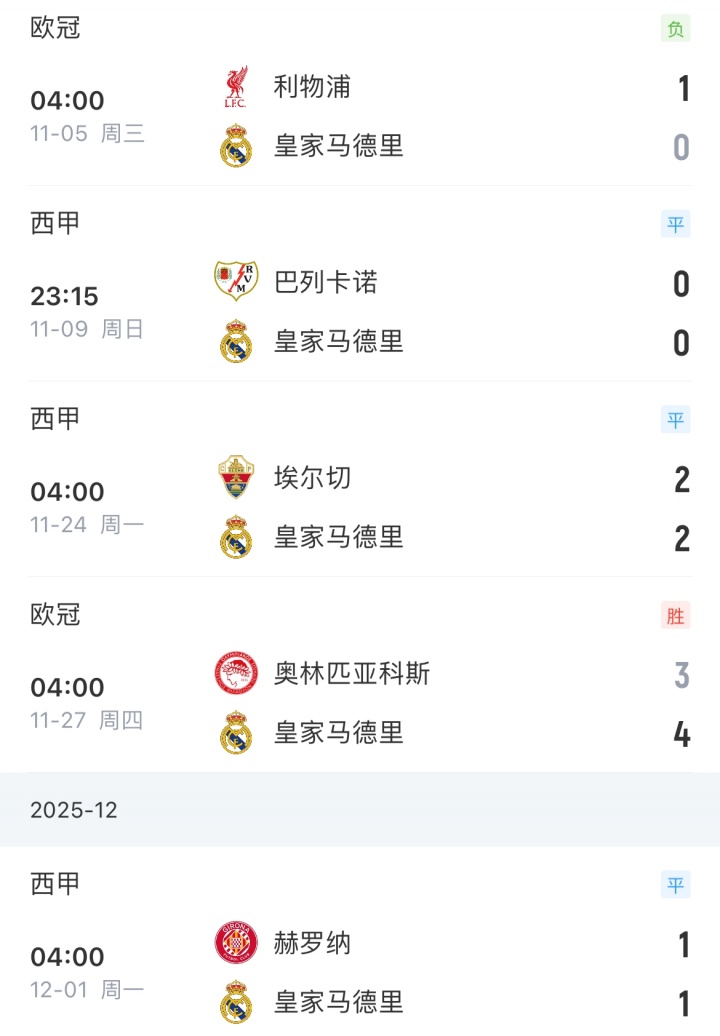 - 2025年12月01日 让出榜首!皇马1-1赫罗纳联赛三连平 姆巴佩点射维尼修斯造点